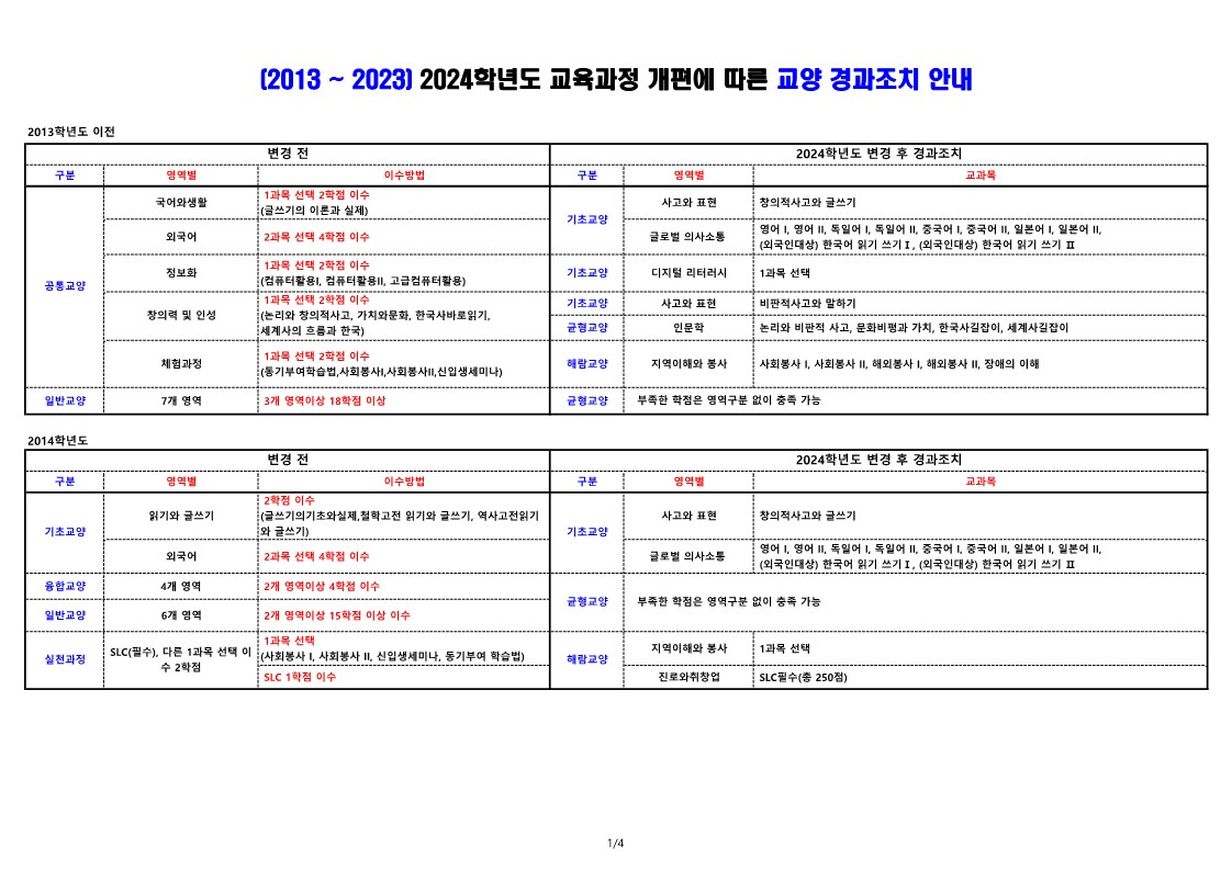 2024학년도 교육과정 개편에 따른 교양 경과조치 안내